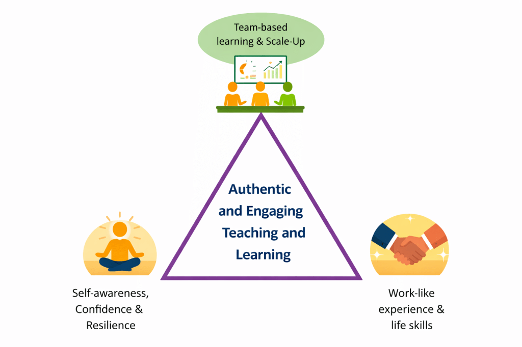 I would summarise the authentic and engaging teaching and learning as being built on three key pillars: work‑like experience, active collaborative learning, and building resilience through coaching.